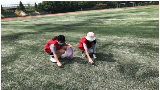 3.听从活动负责人的任务分配,按小组分别前往操场不同地方,到指定地点后开始进行操场的清理工作;