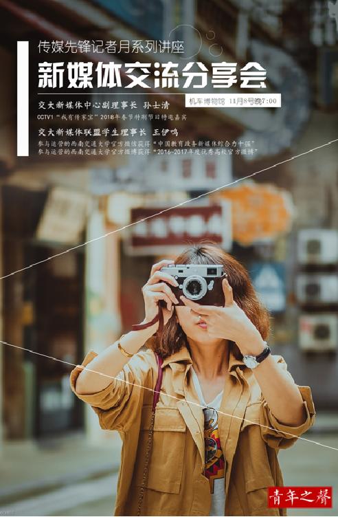 简介:本次活动是由共青团西南交通大学委员会主办,西南交通大学青年传媒全媒体中心、青年之声运营管理中心承办的一场以校园新媒体为主题的交流分享会。本活动邀请了官微理事长王伊鸣以及副理事长孙士清作分享交流,主要面向各个学院新闻中心的成员,分享关于微信公众号的选题、创意策划、新闻摄影等方面内容,促进各学院之间的交流学习。